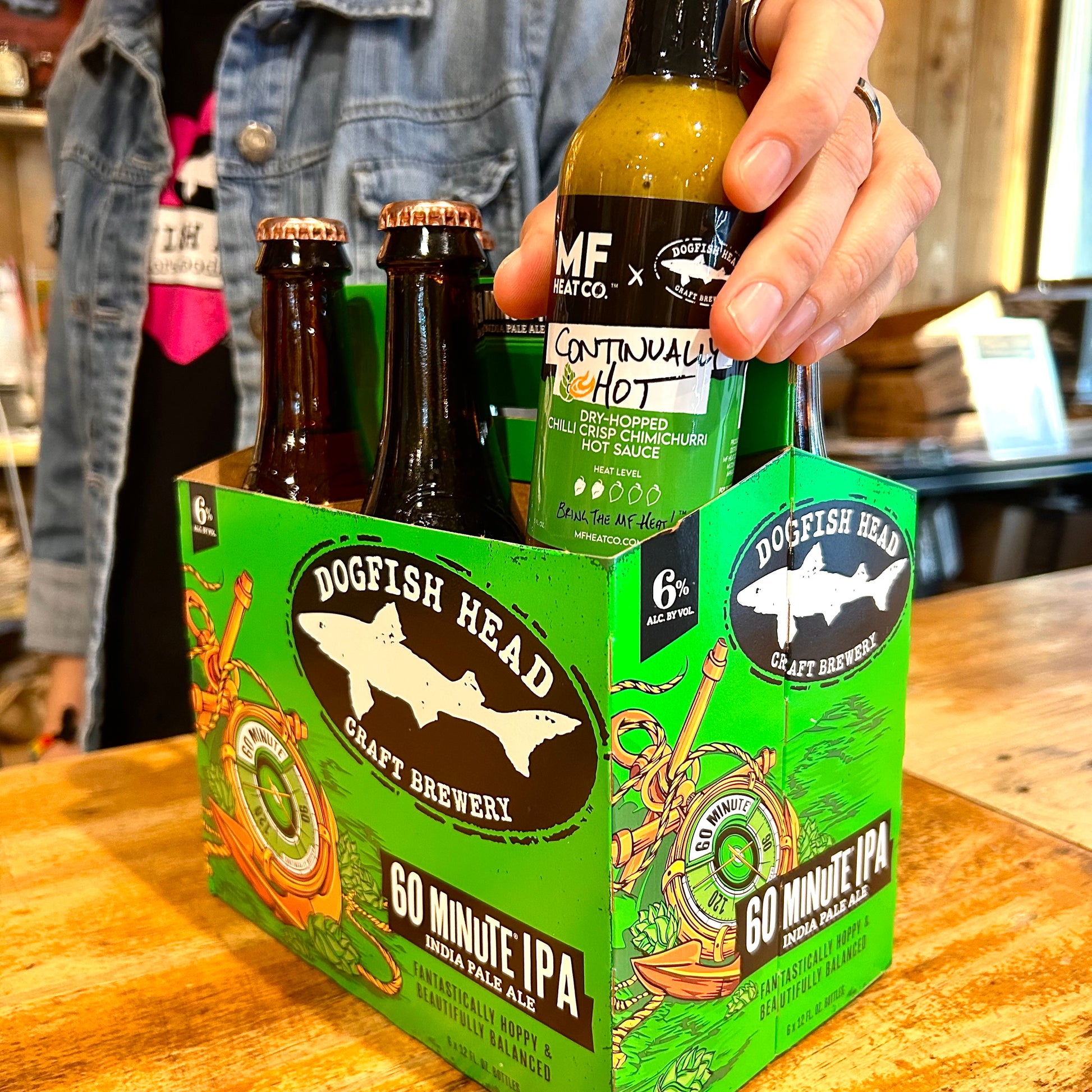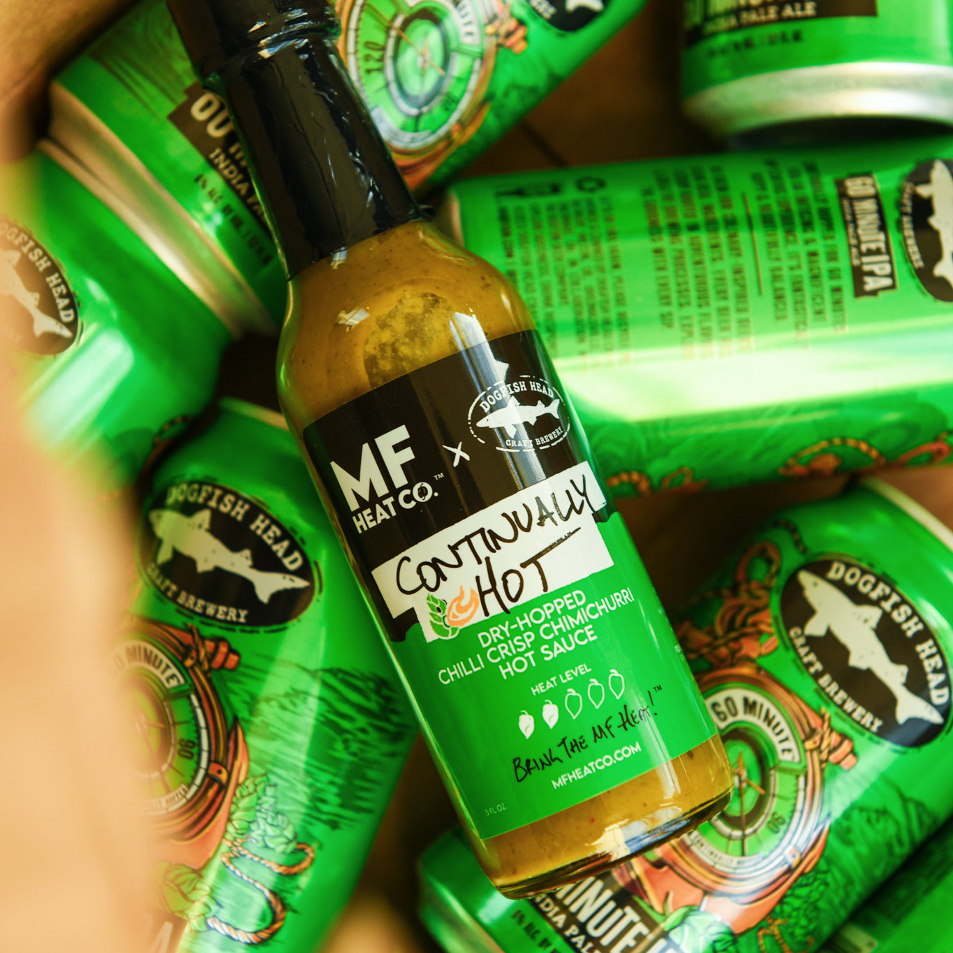 Flavor and heat meet hops in a collaboration between fermented hot sauce and craft beer. MF Heat Co. has teamed up with Delaware's own OG, Dogfish Head Craft Brewery, to create a continually hot sauce that pairs perfectly with Dogfish Head's continually hopped Minute Series IPAs.